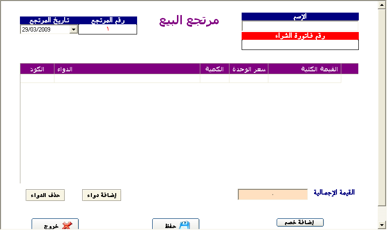 وتحتوي على بيانات العميل ورقم فاتورة البيع التي يتم عمل المرتجع منها في حالة احتياره في المرحلة السابقة